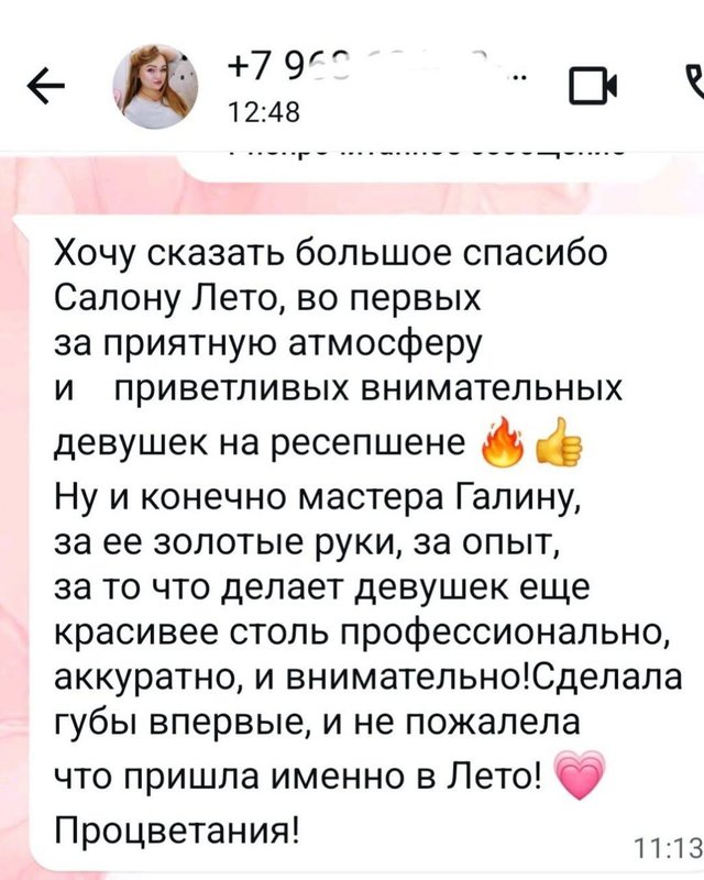 Преимущества: Салон Лето ,близко находится к метро ,так же есть стоянка ,что не мало важно для меня .Так что добраться туда на всех видах транспорта легко и просто .Прекрасный ,красивый ,светлый салон .Хорошое администраторы ,все кто выходят с разных услуг -видно ,что очень довольны .Так же и я ,не первый раз и мастер Анна сделала все идеально .Мои губы теперь идеальные .Спасибо !!!S2724